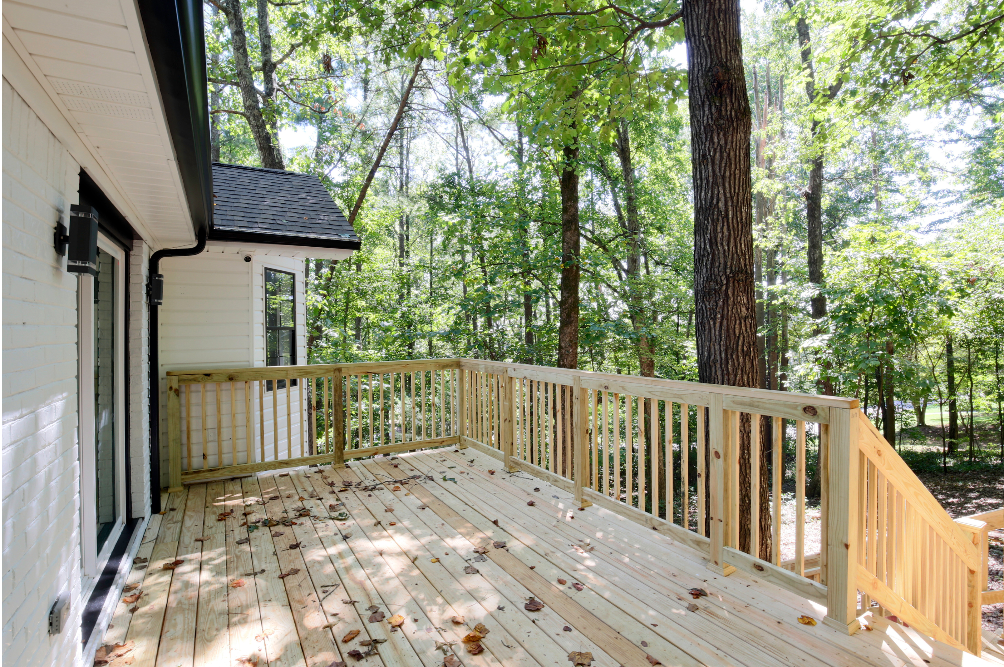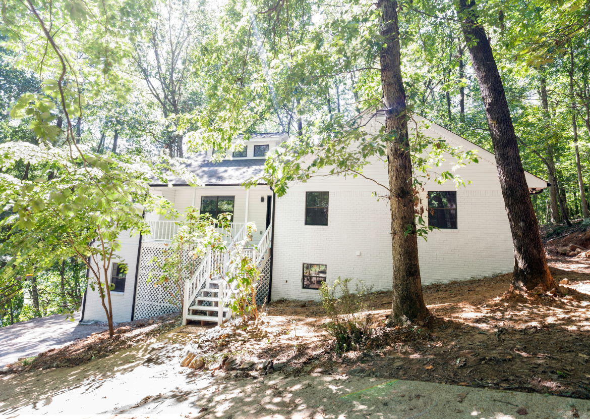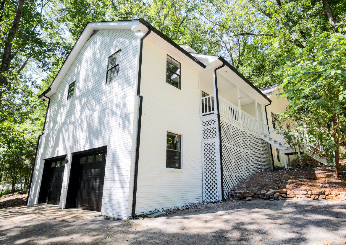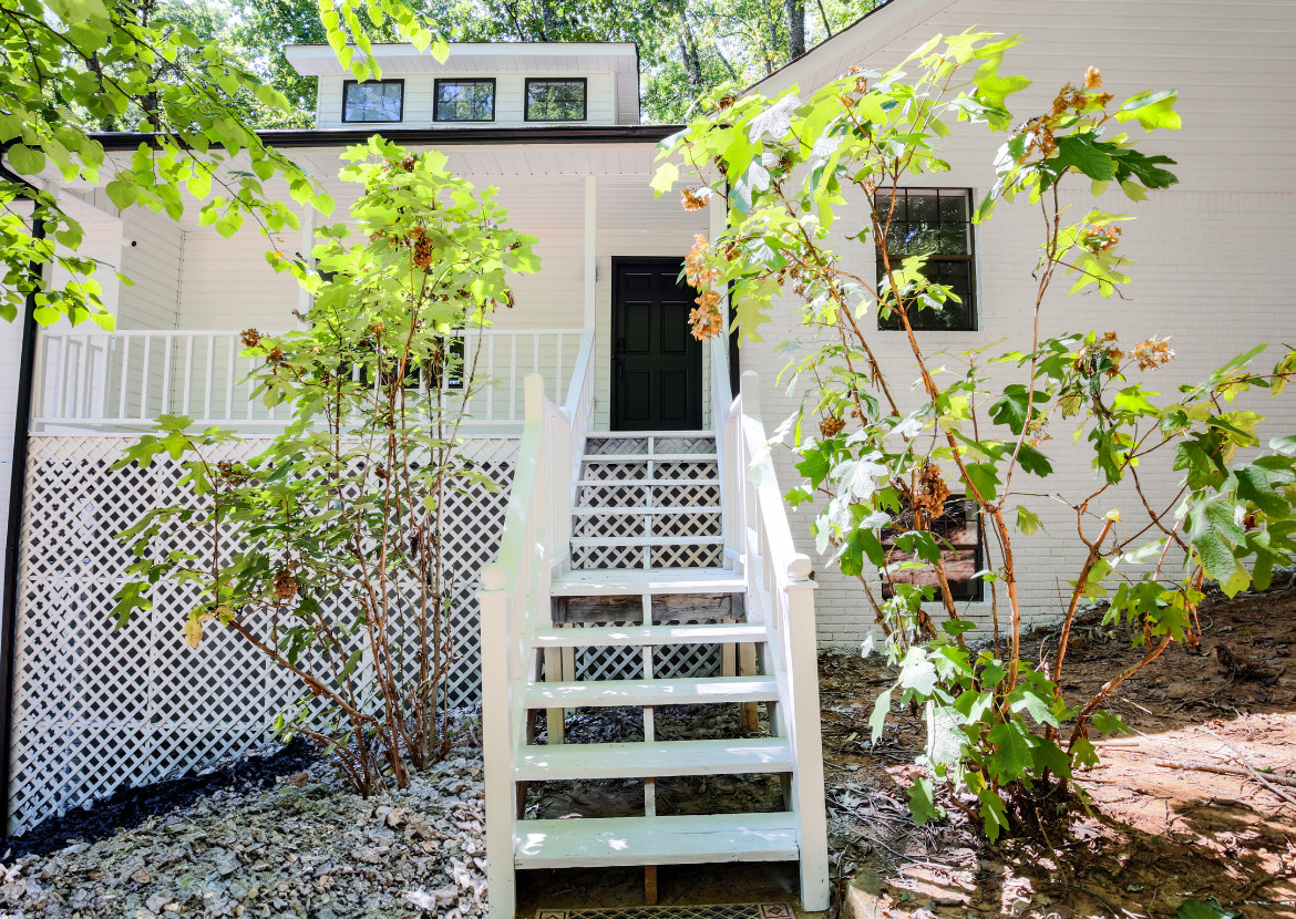 The exterior received a dramatic makeover. A fresh coat of modern white paint instantly updated the home’s appearance, creating a sleek and sophisticated facade. A spacious new wood patio behind the house, perfect for al fresco dining and entertaining, was added, along with custom wood stairs.