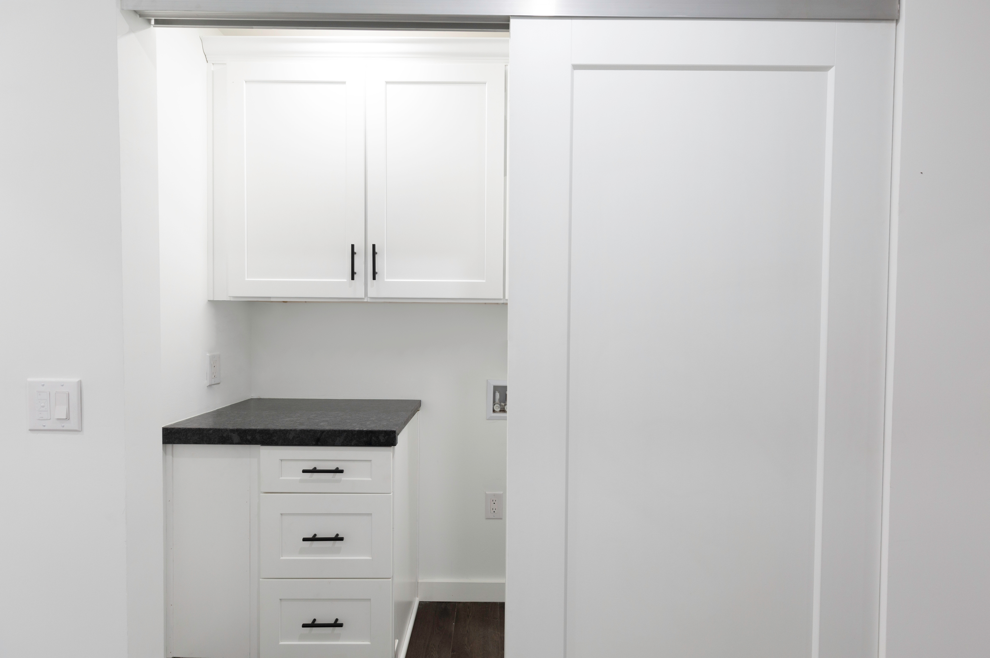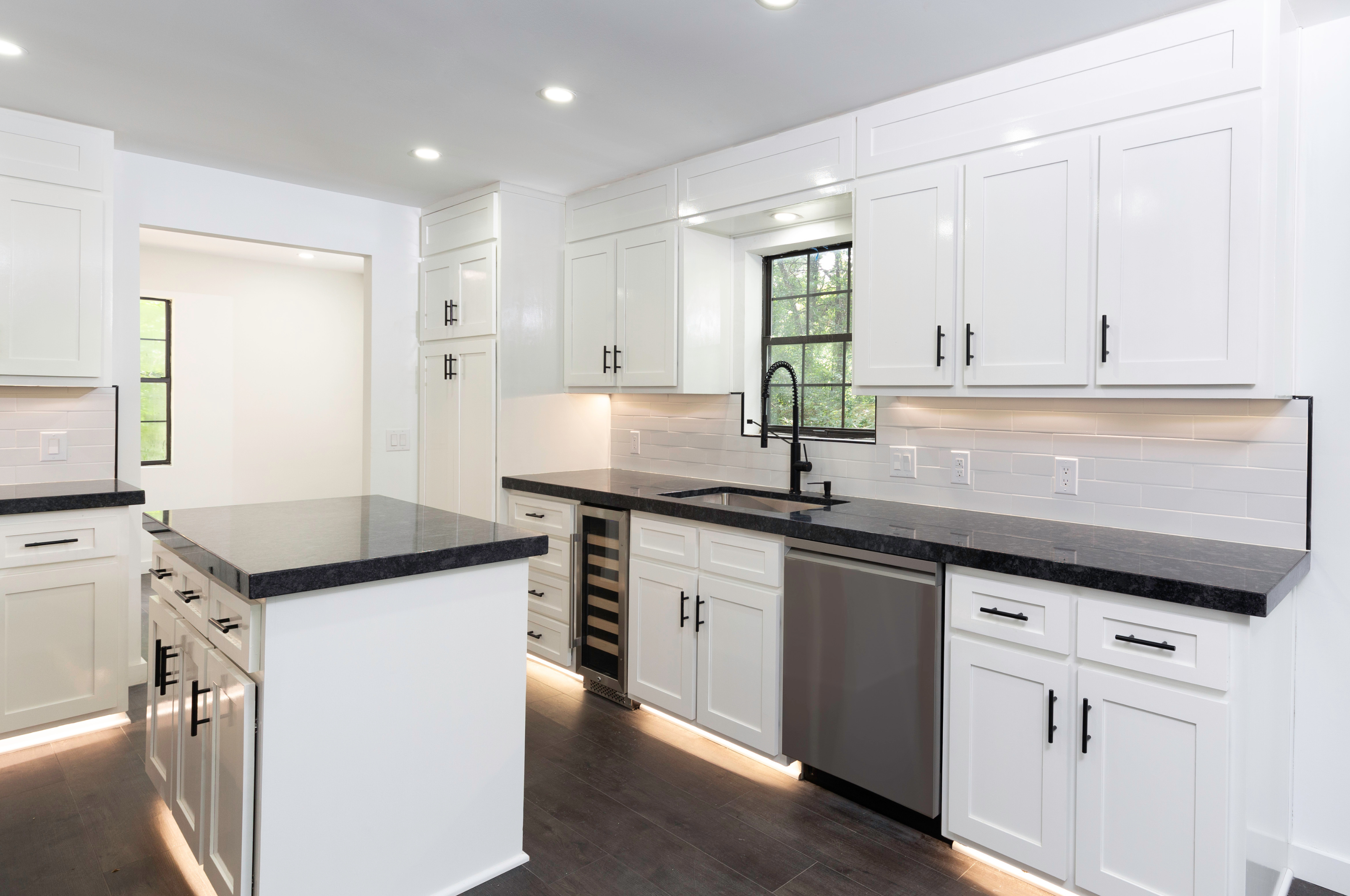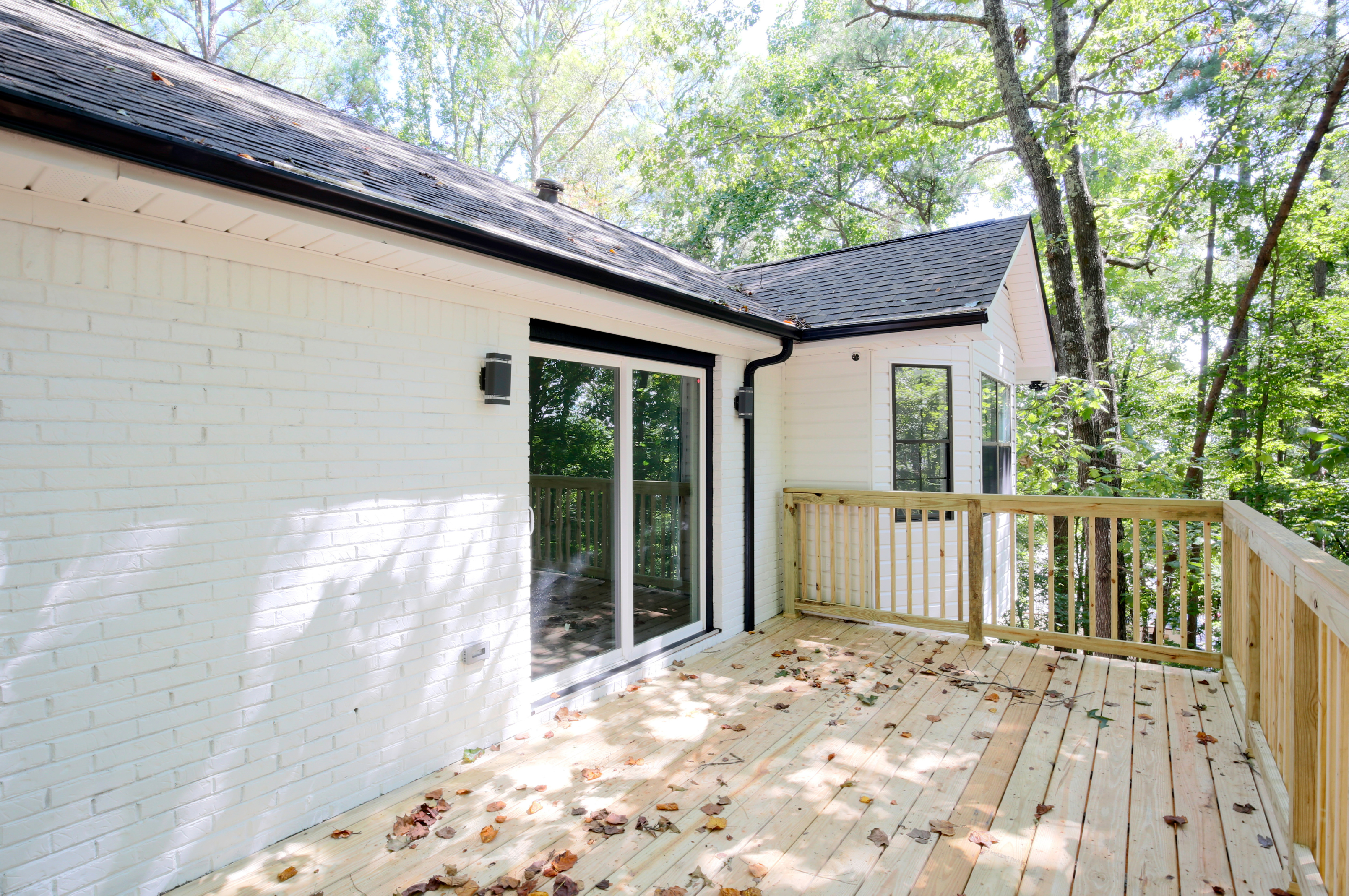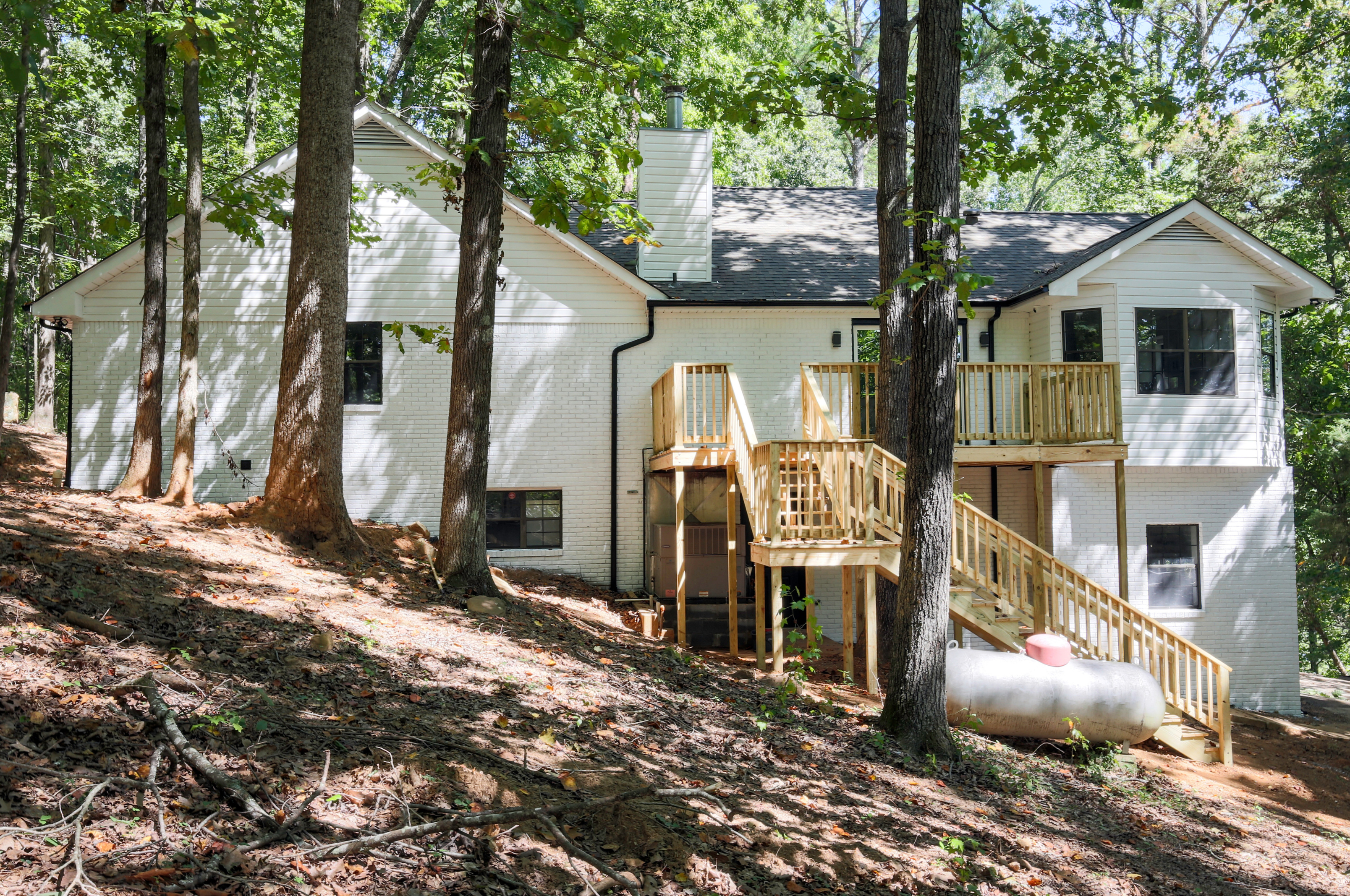 The exterior received a dramatic makeover. A fresh coat of modern white paint instantly updated the home’s appearance, creating a sleek and sophisticated facade. A spacious new wood patio behind the house, perfect for al fresco dining and entertaining, was added, along with custom wood stairs.
