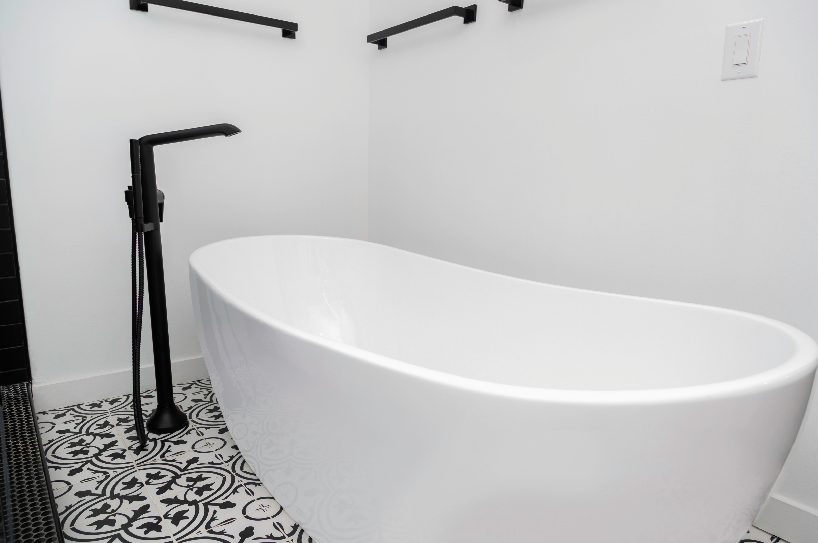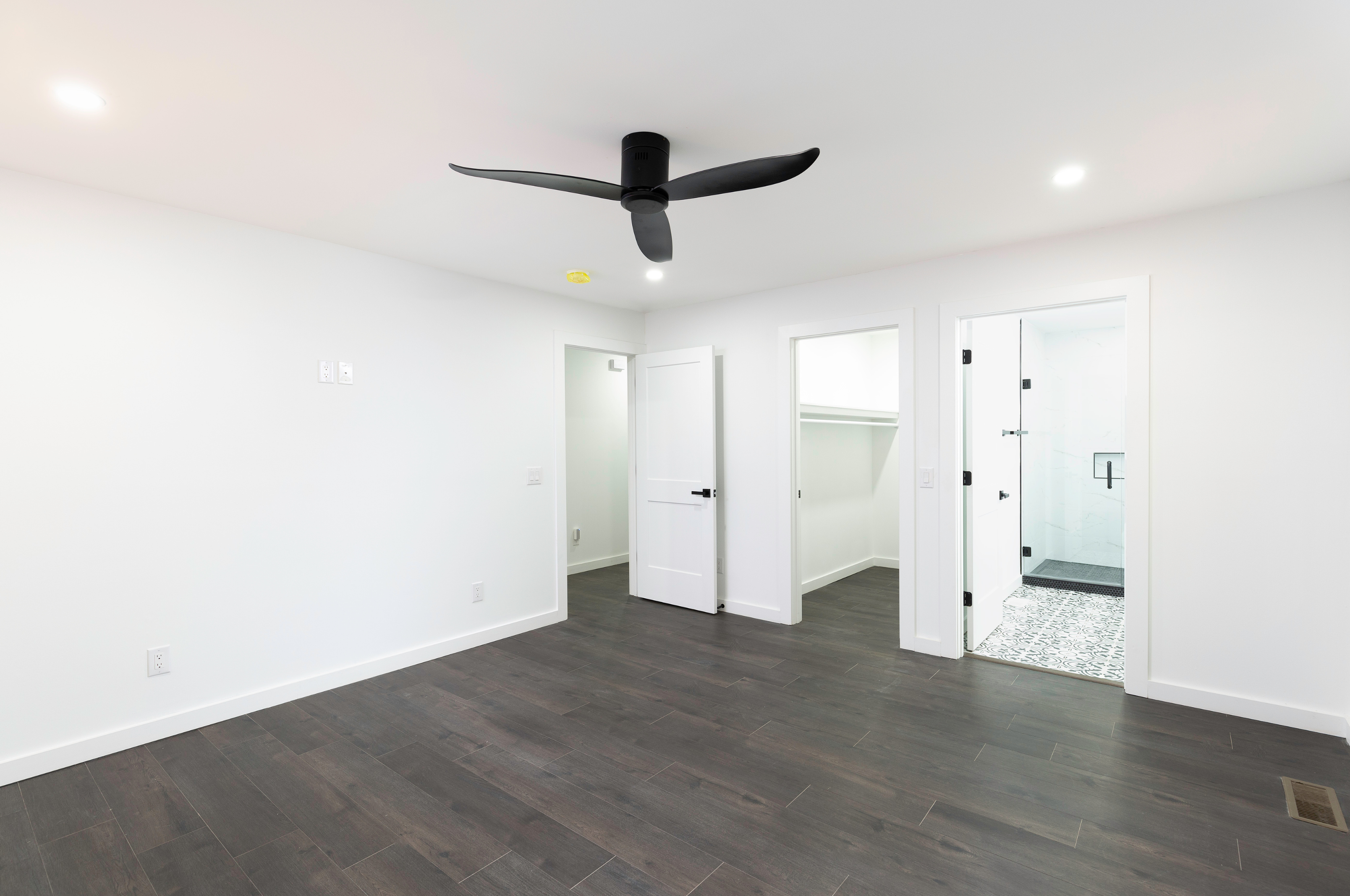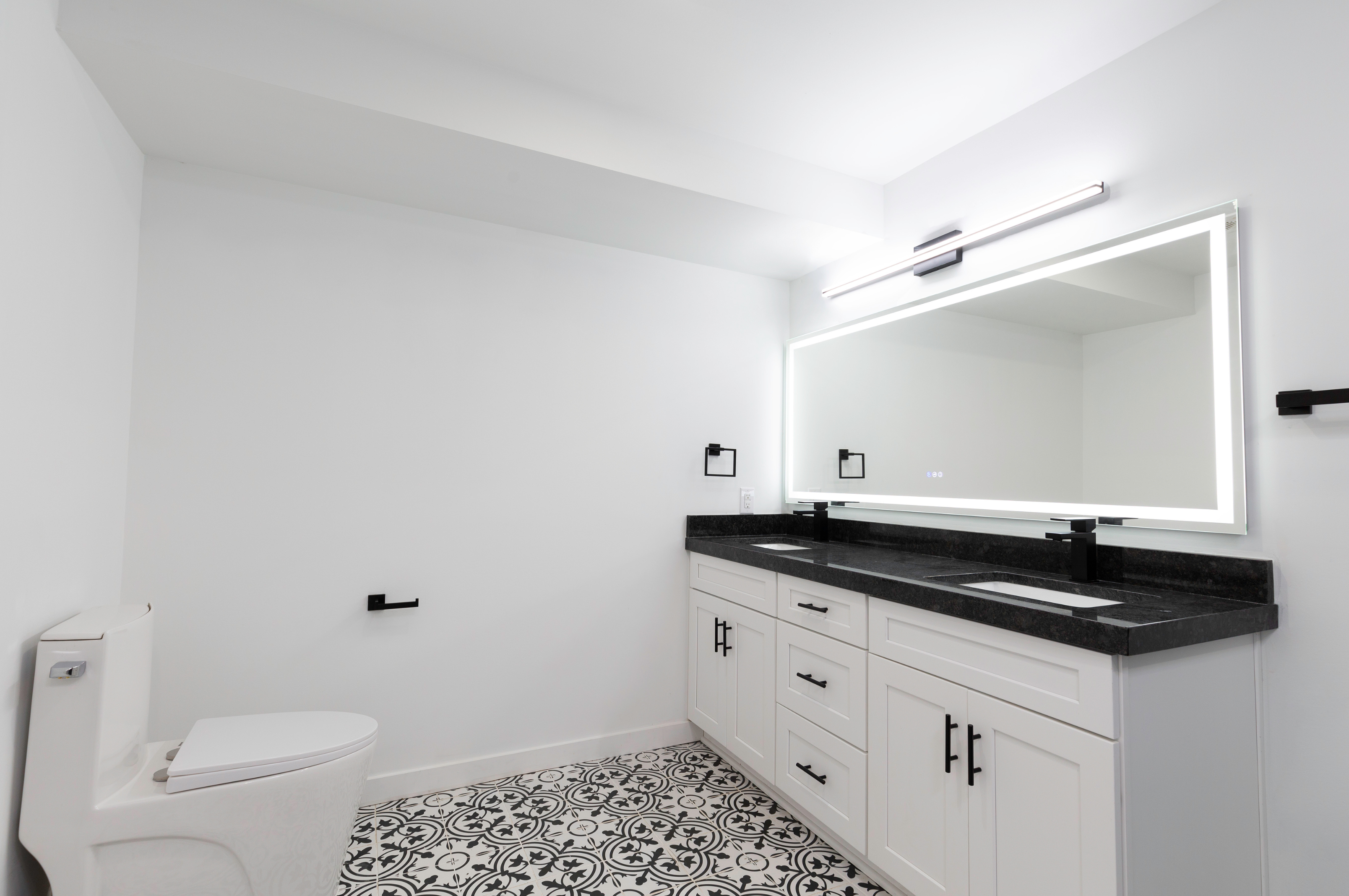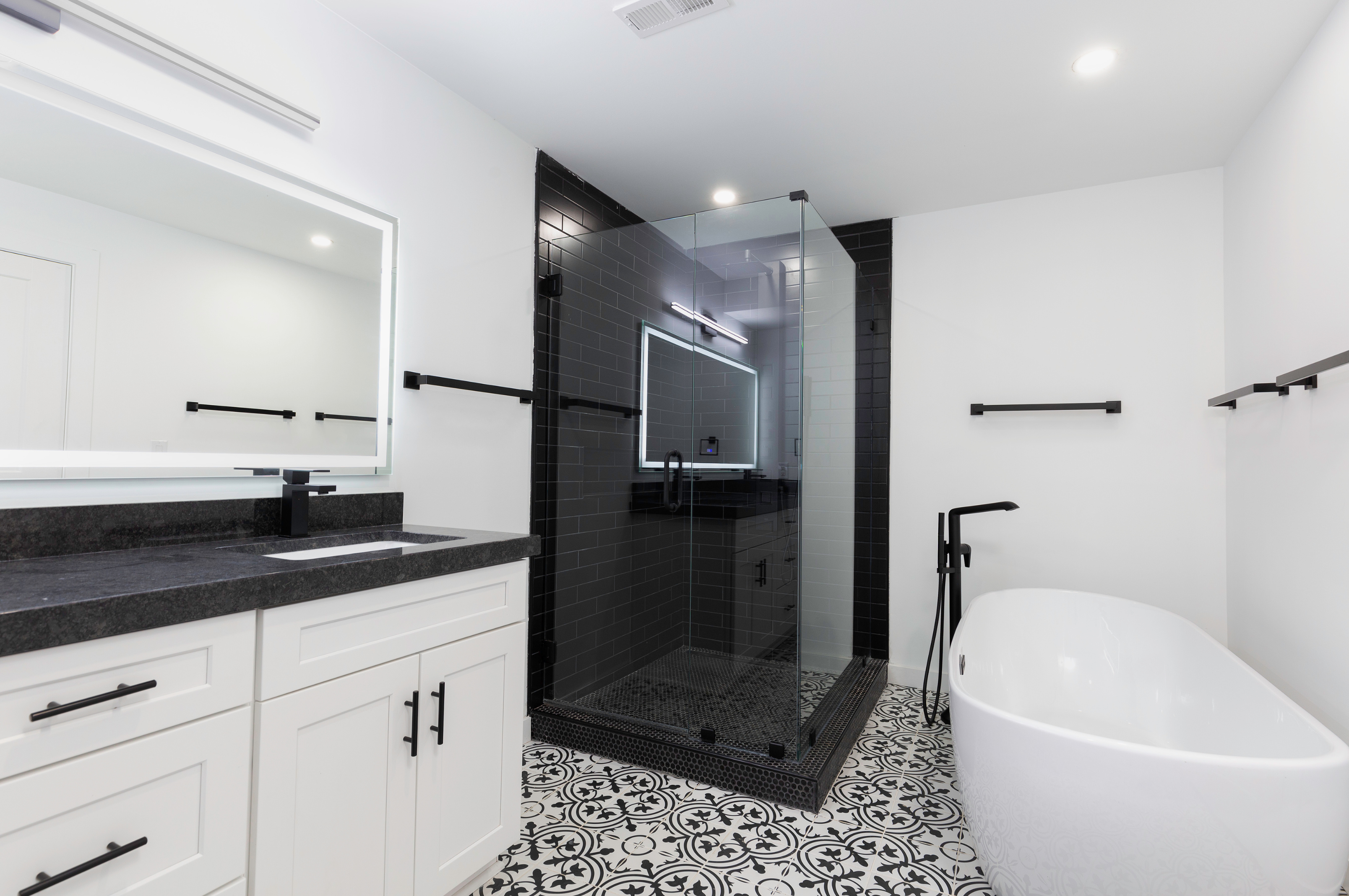 The bathrooms were also given a luxurious upgrade, boasting freestanding tubs, frameless glass showers, and double vanities. New lighting fixtures, tile flooring throughout, and custom built-ins in the living room further enhanced the home’s modern aesthetic.