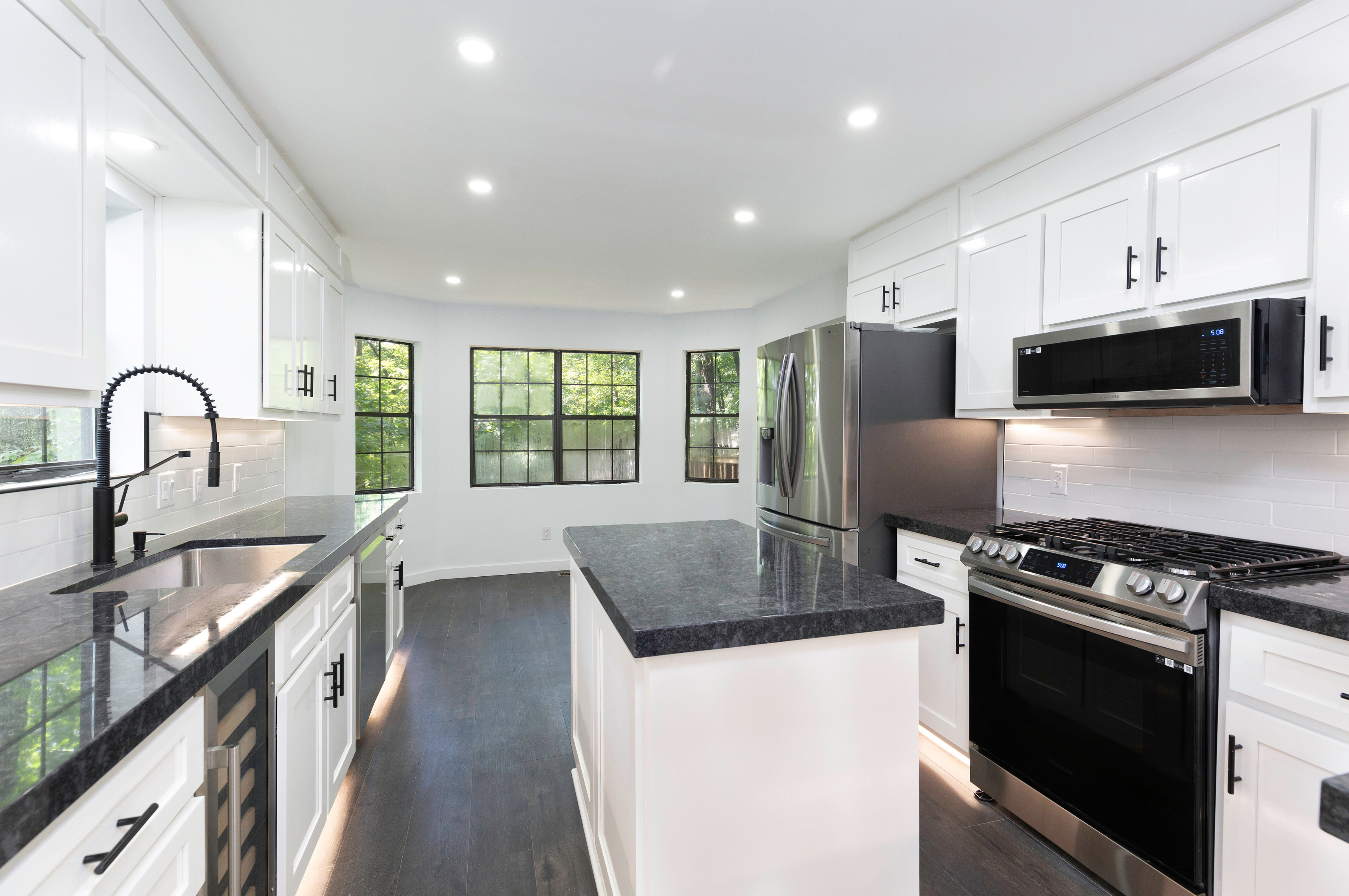 Inside, the transformation was equally impressive & extensive. The once-cramped kitchen was gutted and reimagined as a culinary haven, featuring contemporary white cabinetry, gleaming marble countertops, top-of-the-line appliances, and an island that serves as a focal point for family gatherings.